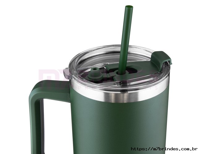 Caneca térmica em inox com alça reforçada, pintura eletrostática e capacidade para até 1,3 litro. Apresenta estrutura de parede dupla e vedação a vácuo, permitindo conservar a temperatura de líquidos por mais tempo. Dispõe de tampa em plástico com protetor para o bocal e acesso central para canudo. Acompanha canudo em plástico PP. Altura : 25,1 cm Largura : 14,6 cm Circunferência : 31,3 cm