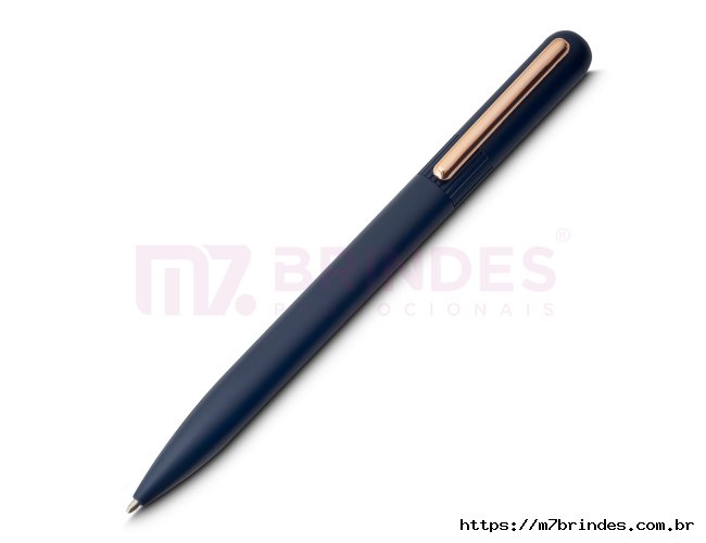 Caneta esferográfica em alumínio e clip em latão reciclável com escrita em azul.