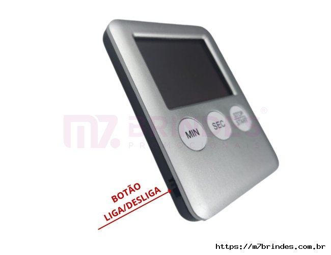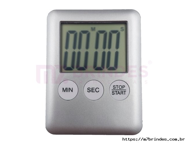 Cronometro com timer em plástico com pintura fosca metalizada, 3 botões para ativar, desativar a contagem. Parte traseira com um imã para superfícies metálicas, compartimento para a bateria, e um botão lateral deslizante com função liga e desliga.
