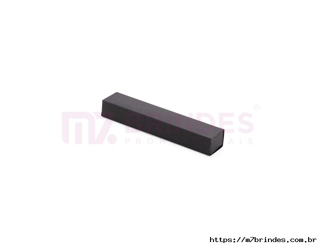 Estojo em papelão com abertura estilo gaveta e berço aveludado e elástico para fixar uma caneta.