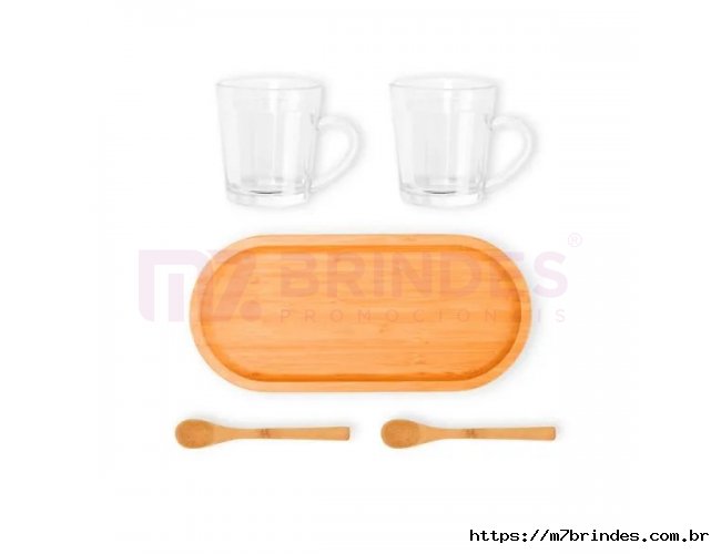 Kit para café. Composto por duas canecas americano em vidro; bandeja e duas colheres de 13 cm em Bambu.