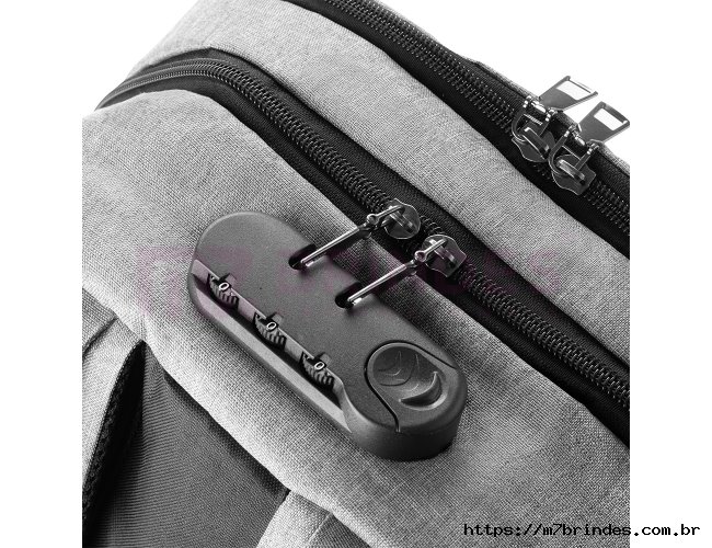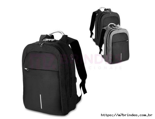 Mochila confeccionada em tecido externo de poliéster 300D e tecido interno em poliéster 210D. Possui fechamento em cadeado com segredo, bolso frontal com zíper, faixa reflexiva na parte frontal, saída USB e para fone de ouvido. Conta com alça de mão em metal, alça de ombro acolchoada, engate para mala de viagem e dois grandes compartimentos com fechamento em zíper, sendo um para pequenos objetos e outro específico para notebook de até 15,6” - Dimensão do Produto: 43x29x14cm