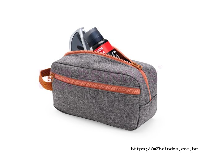 Nécessaire confeccionada em poliéster resistente à água e fechamento em zíper. Além do compartimento principal, dispõe de bolso frontal externo e alça lateral de mão em nylon. Altura : 12 cm Profundidade : 9 cm Comprimento : 22 cm