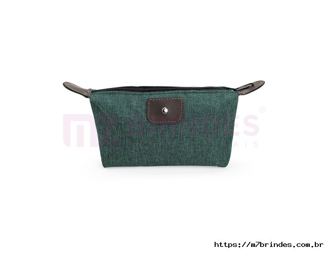 Nécessaire compacto confeccionado em Poliéster com mescla de PVC resistente à água, com fechamento em zíper e detalhes em bidim e metal.