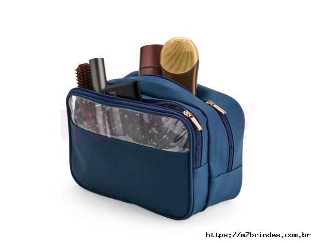 Nécessaire confeccionada em filme sintético de poliuretano impermeável. Possui dois bolsos no compartimento interno principal, sendo um com fechamento em zíper e outro em tela de nylon. Dispõe ainda de compartimento frontal com viseira e revestimento interno em PVC, ideal para guardar itens molhados. Altura : 16 cm Largura : 25 cm Profundidade : 10 cm