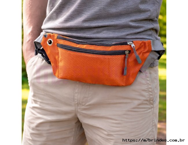 Pochete esportiva confeccionada em poliéster filamentado resistente à água. Possui cinto ajustável com fivela plástica de encaixe, saída para fones de ouvido e três compartimentos com fechamento em zíper, sendo dois na parte frontal e um traseiro antifurto. Altura : 11 cm Largura : 29 cm