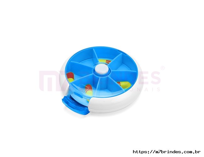 Porta-comprimidos em plástico. Com design compacto, possui sete divisórias e um botão de acionamento que movimenta o mecanismo de giro de compartimentos a cada clique.permitindo o acesso ao conteúdo por meio de uma abertura lateral. Largura : 9 cm Espessura : 2,6 cm Comprimento : 9 cm
