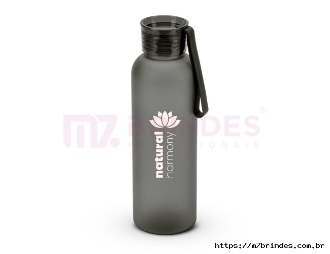 Squeeze esportiva em PET 100% reciclado, com acabamento fosco. A tampa em PS, à prova de vazamentos, possui fita em silicone que facilita o transporte. Capacidade até 600 mL. Certificação EU Food Grade. ø66 x 215 mm