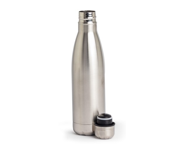 Garrafa em aço inox com capacidade de até 750 ml. Tampa rosqueável e anel de silicone para vedação. Design com frisos na tampa.
